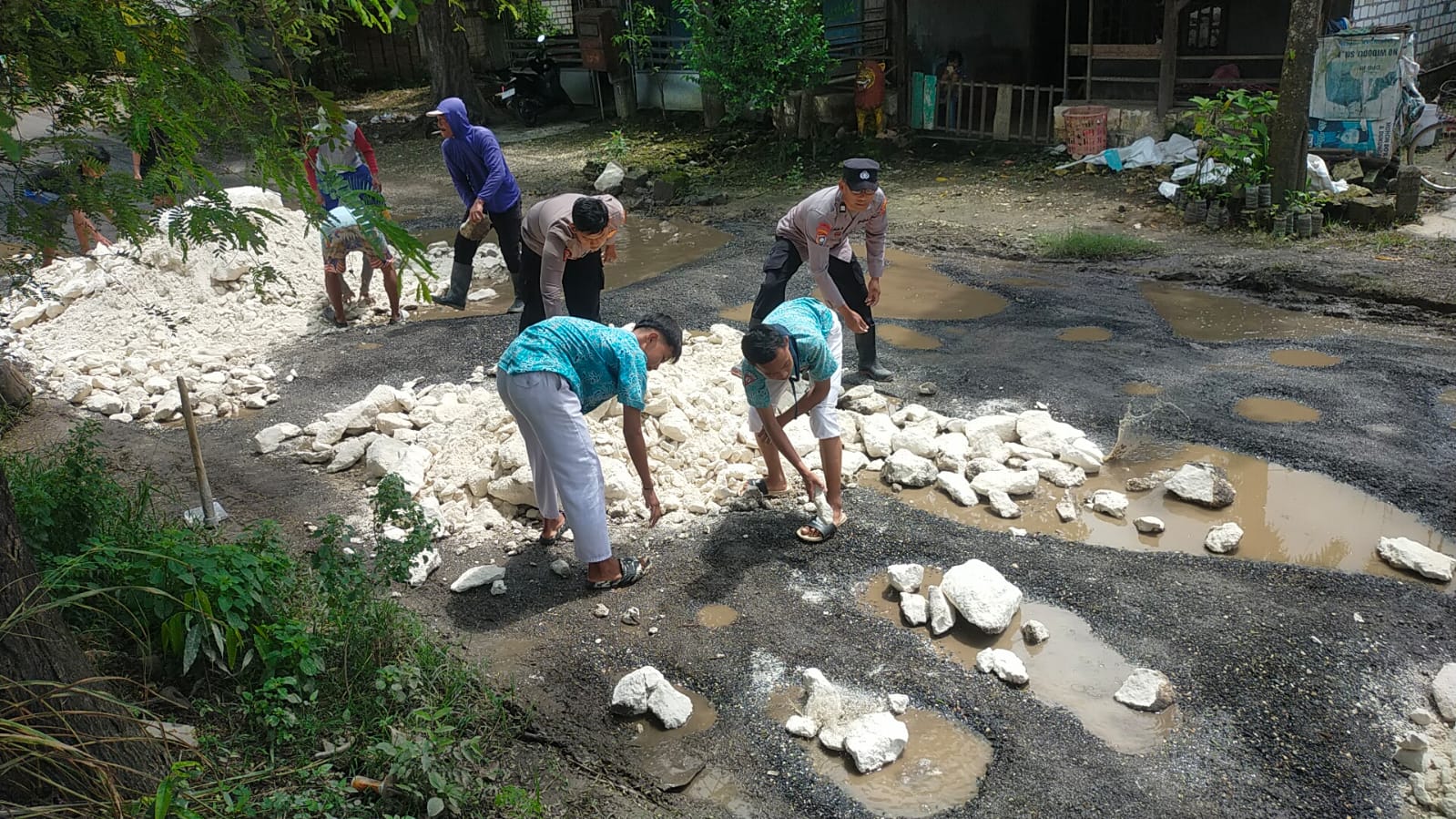 Kegiatan kerja bakti berlangsung dengan penuh semangat dan kekompakan. Semua pihak bahu membahu menimbun dan meratakan jalan yang berlubang.