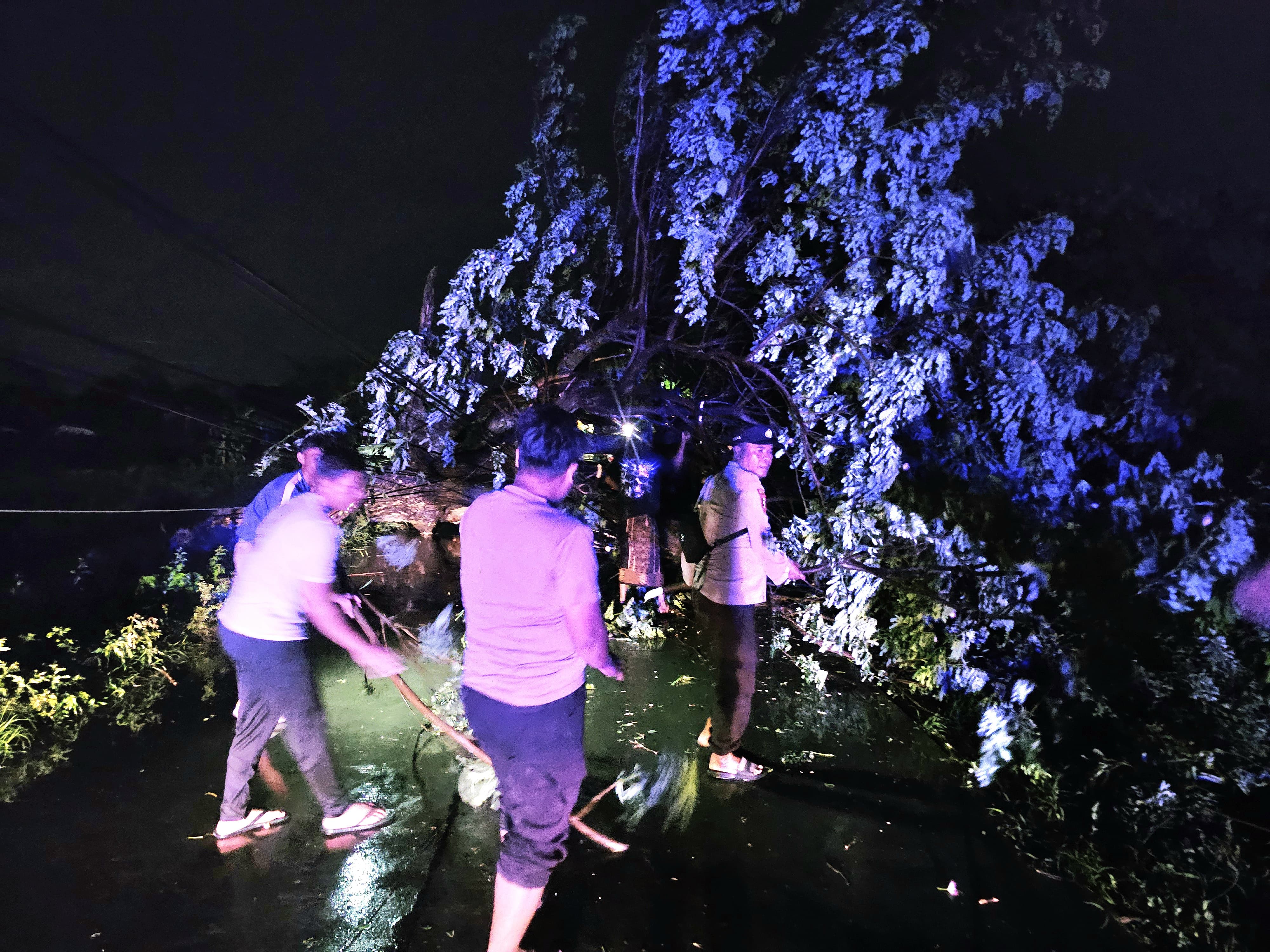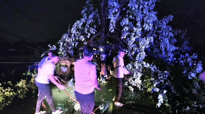 Melaksanakan pemotongan dan pembersihan material pohon tumbang secara gotong royong bersama warga.