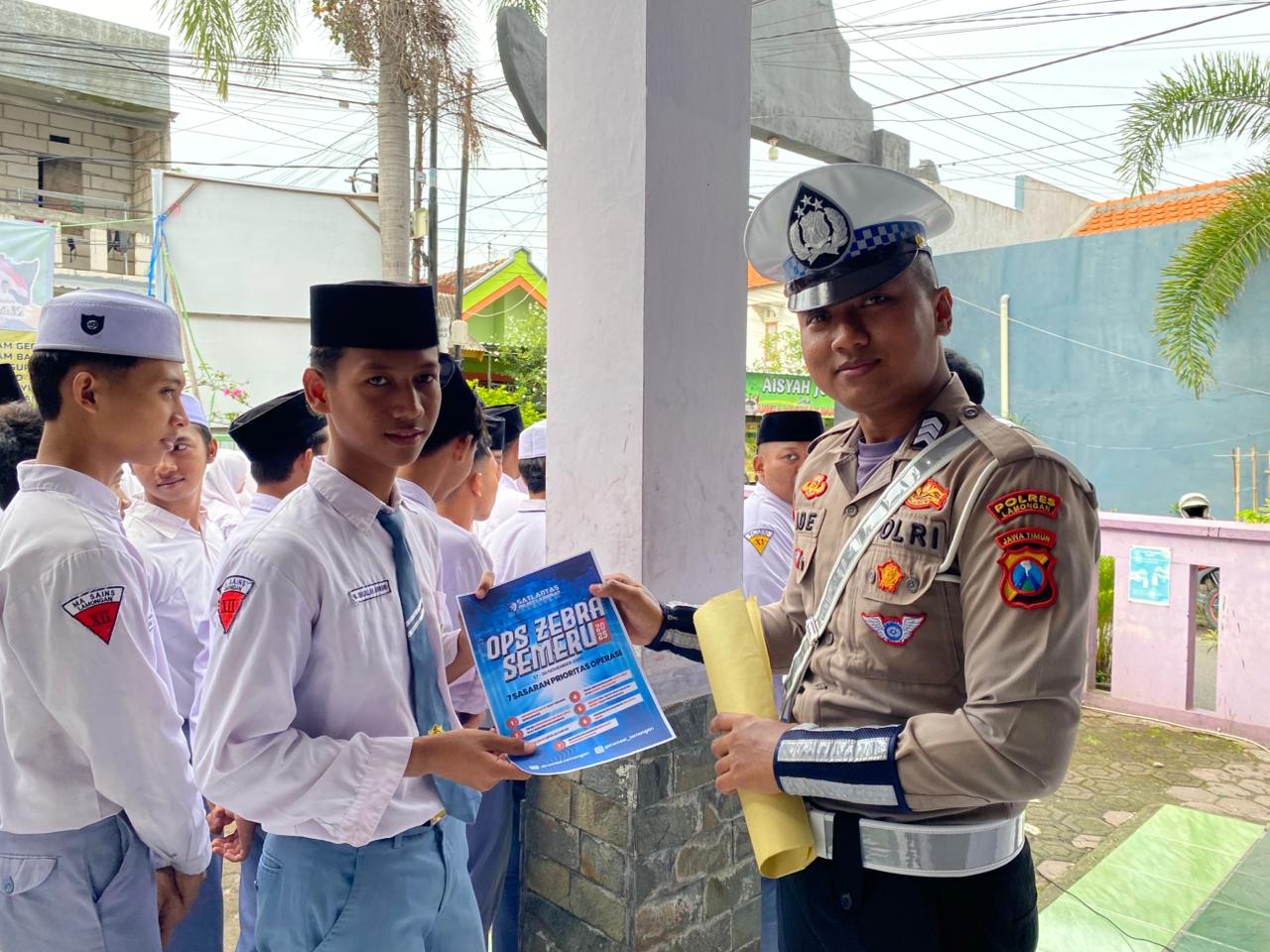 Para siswa juga menerima pamflet berisi imbauan keselamatan sebagai bagian dari upaya Satlantas Polres Lamongan untuk meningkatkan kesadaran dan kepatuhan berlalu lintas di kalangan pelajar dalam rangka mendukung suksesnya Operasi Zebra Semeru 2025.