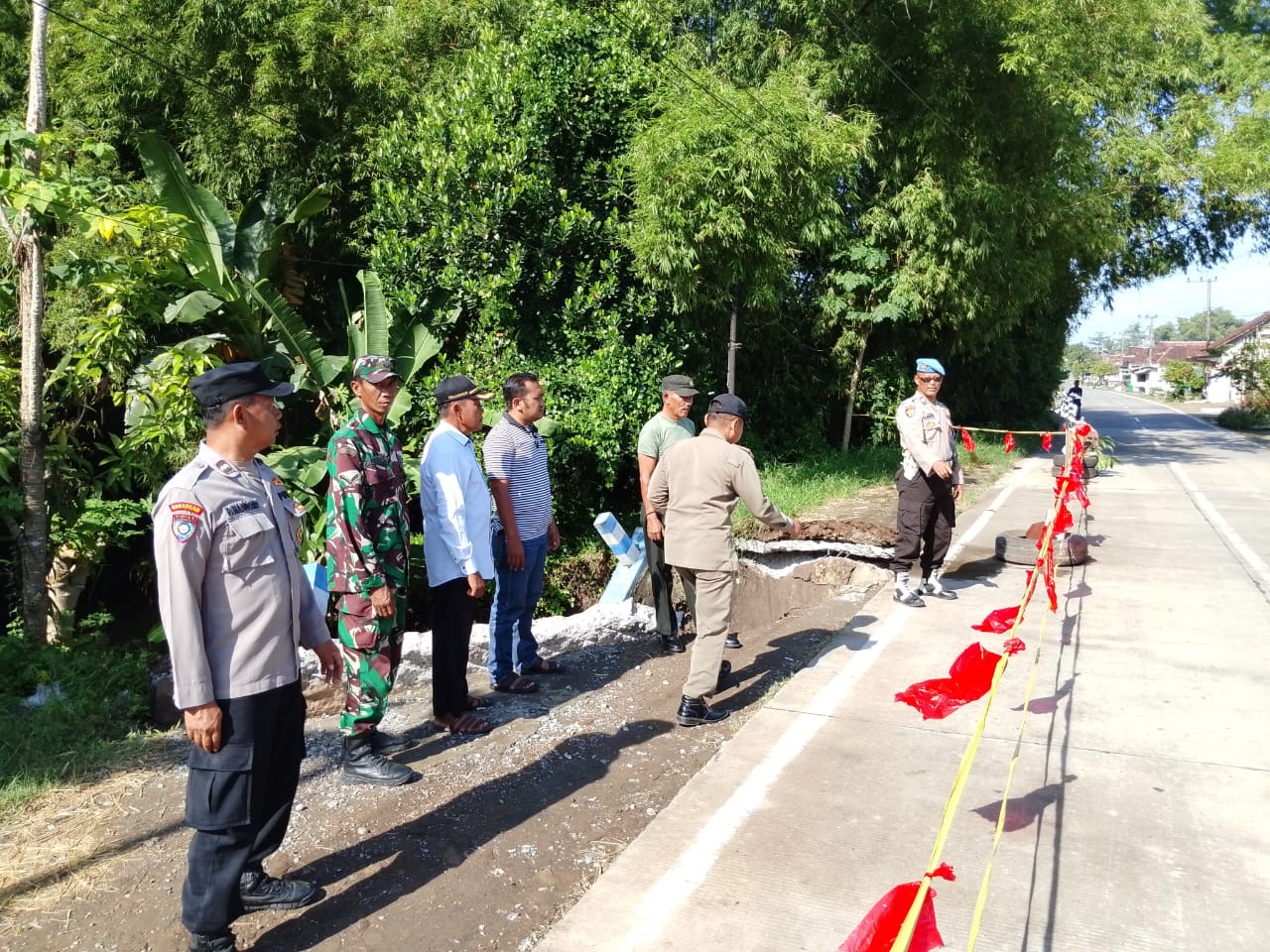 Petugas melakukan pengamanan lokasi, pengecekan kondisi kerusakan, serta mengantisipasi potensi bahaya lanjutan bagi pengguna jalan dan masyarakat sekitar dengan pemberian rambu rambu petunjuk keselamatan disekitar lokasi yang longsor