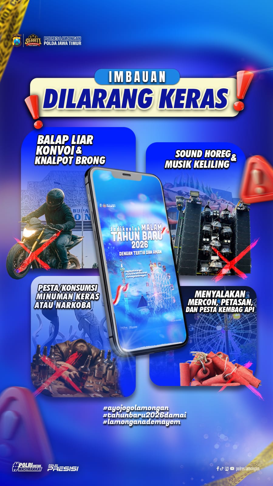 Polres Lamongan mengajak seluruh masyarakat untuk menjadikan malam pergantian Tahun Baru 2026 sebagai momentum kebersamaan yang positif dengan tetap menjunjung tinggi nilai ketertiban, keamanan, dan keselamatan.