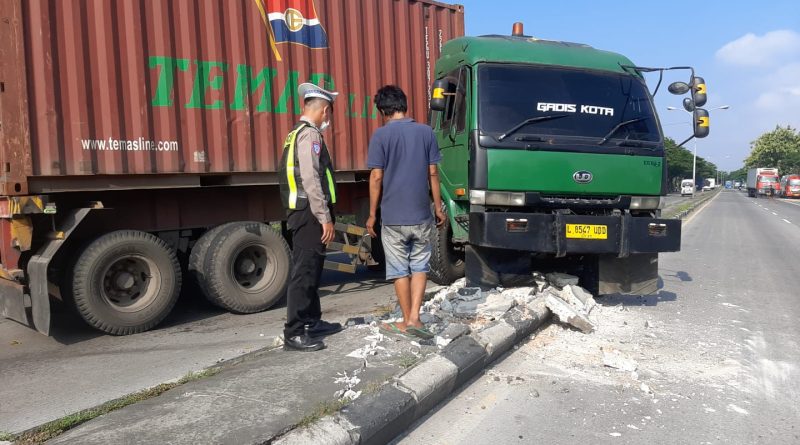 Truk tersebut dikemudikan oleh seorang pria berinisial K (42), warga Kecamatan Sambikerep, Kota Surabaya. Beruntung, dalam kejadian tersebut tidak dilaporkan adanya korban jiwa.
