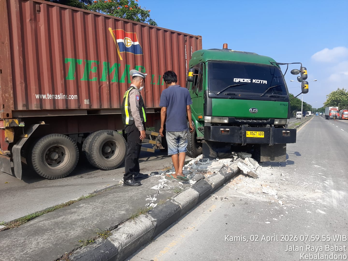 Peristiwa tersebut terjadi pada Rabu (2/4) sekira pukul 07.40 WIB, saat sebuah truk petikemas dengan nomor polisi L-8547-UDD mengalami hilang kendali hingga naik ke median jalan di Jalan Raya Lamongan–Babat, tepatnya di depan SPBU AKR Kebalandono Babat.