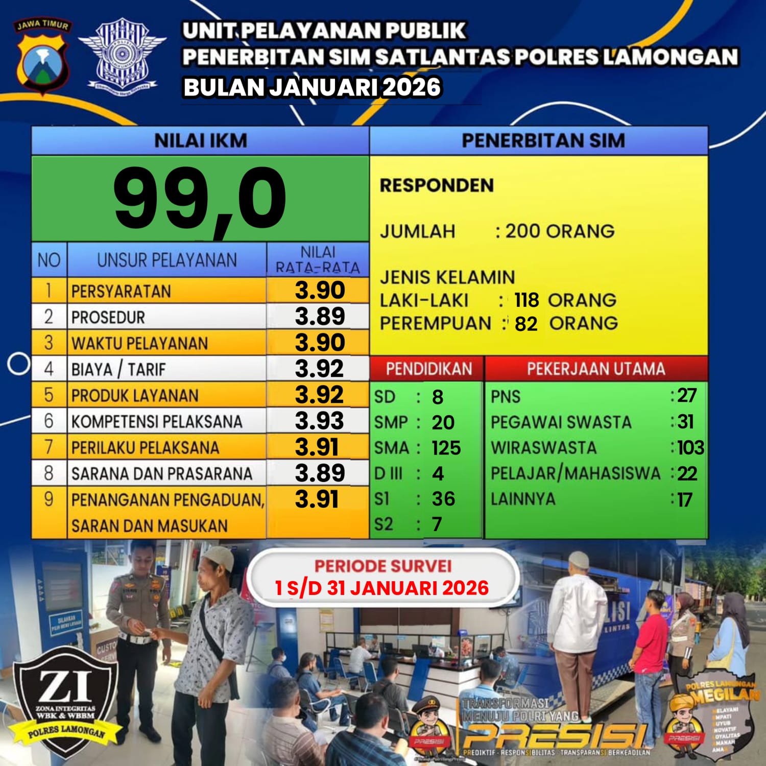 Berdasarkan hasil survey yang melibatkan 200 responden, diperoleh nilai Indeks Kepuasan Masyarakat (IKM) sebesar 99,0. Capaian ini menunjukkan bahwa kualitas pelayanan yang diberikan berada dalam kategori sangat baik, serta mencerminkan komitmen Polres Lamongan dalam memberikan pelayanan prima kepada masyarakat.